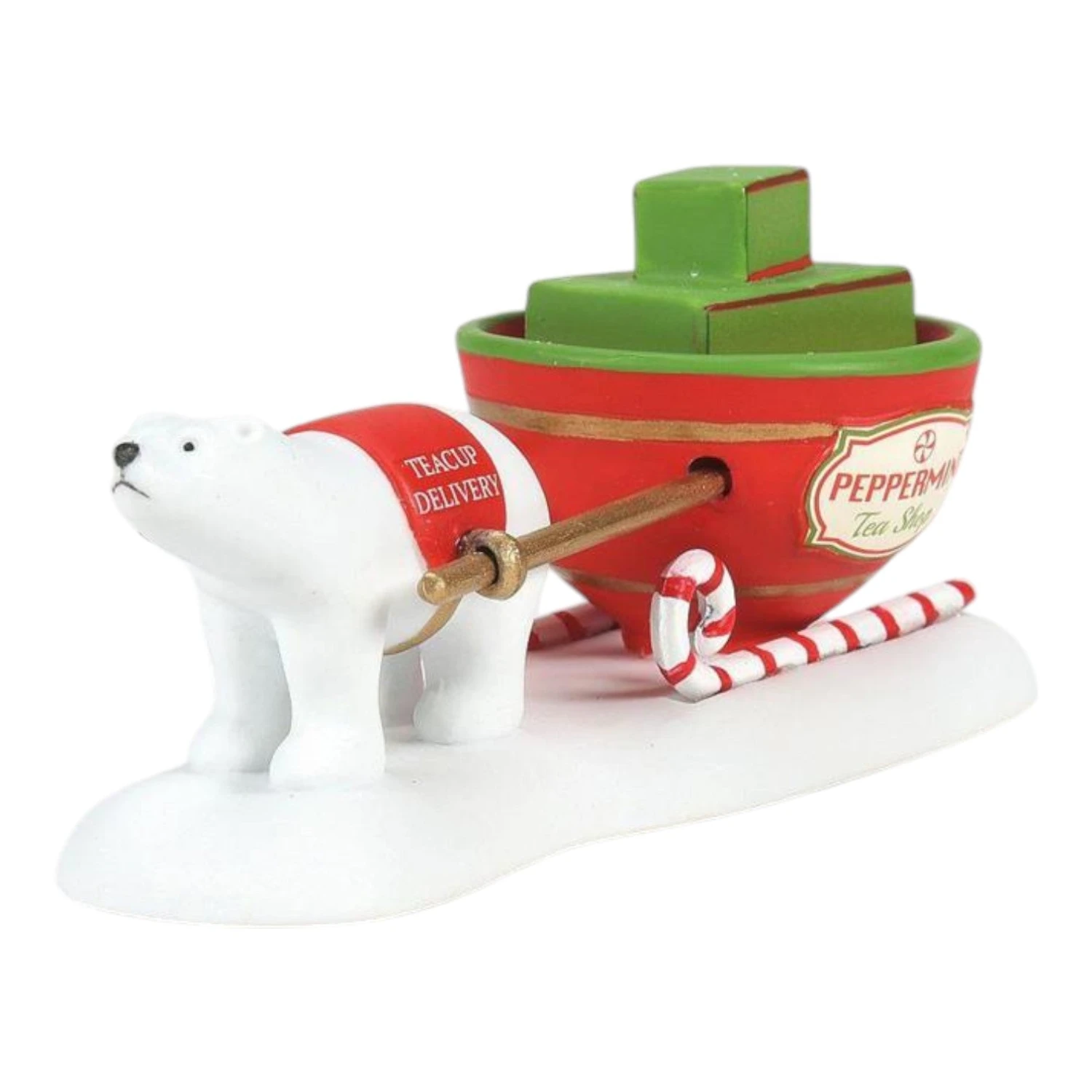 Add a sprinkle of whimsy to your holiday village with the charming “Peppermint Tea Shop Delivery” figure! Standing at just under 1.5 inches tall, this delightful piece features an adorable polar bear pulling a beautifully designed sleigh filled with vibrant tea cups and colorful tea boxes. This charming scene captures the essence of a community that delights in the simple pleasures of tea, making it a perfect addition to your festive display.