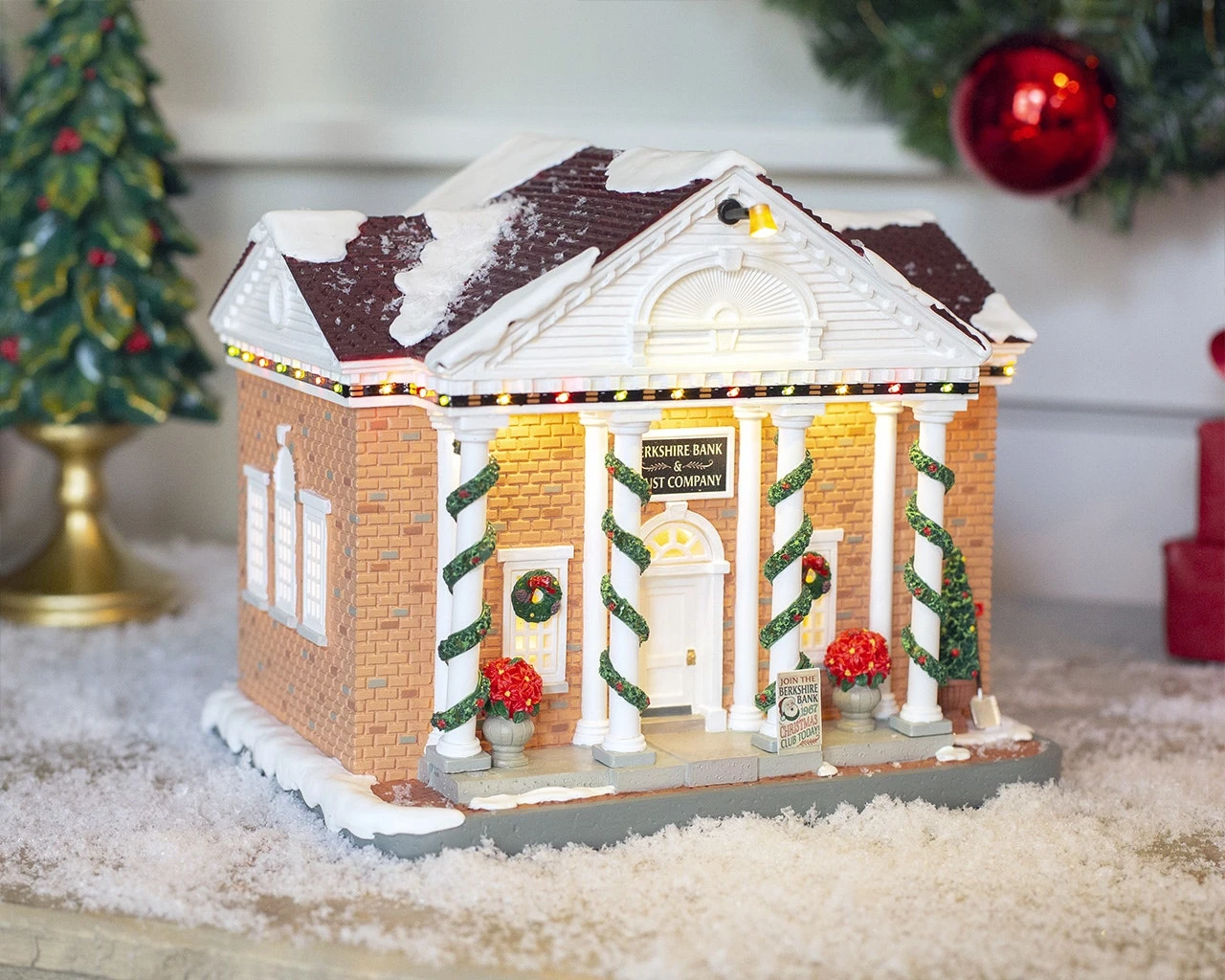 The Berkshire Bank & Trust Company is a classic red-brick bank. Its four towering white columns are wrapped in garland for the holiday season, with poinsettias and a Christmas tree decorating the snowy front stoop.