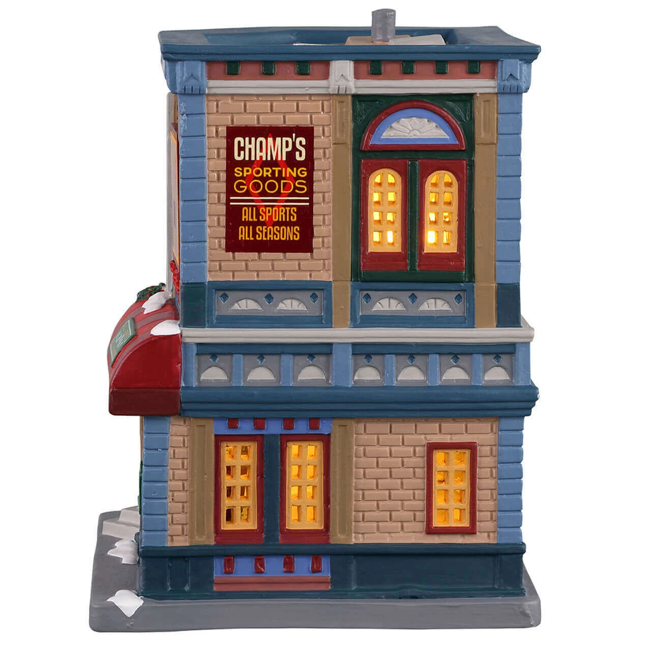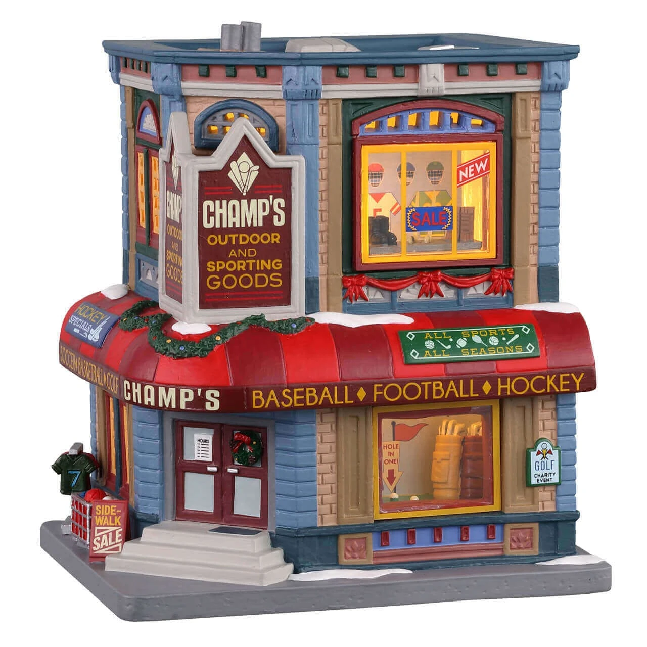This detailed figurine set showcases “Champ’s Outdoor and Sporting Goods,” a vibrant and bustling store perfect for adding a dynamic touch to your Christmas village. The two-story building is richly adorned with holiday decorations and eye-catching displays. The exterior is painted in festive colors, featuring a large sign that reads “Champ’s Outdoor and Sporting Goods” prominently on the upper part of the building. The walls are decorated with red garlands and bows, adding holiday cheer to the sporty storefront.