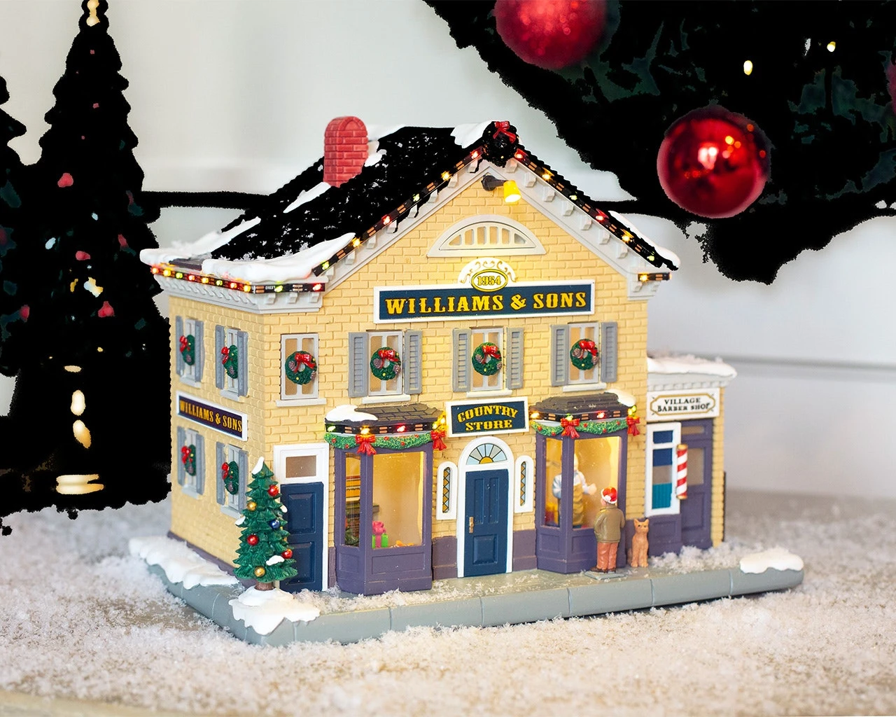 Williams & Sons Country Store is a charming little store that’s connected to the local barber shop. A little boy and his dog are looking through the window, admiring the Christmas decorations being set up by the shop owner.